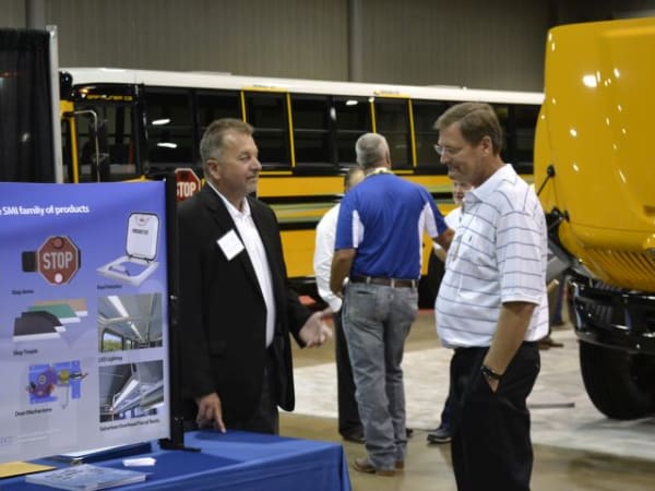 SESPTC’s trade show featured new alternative-fuel school buses and other products from about 60 vendors. Here, Jim Haigh of Safe Fleet (left) talks with Texas pupil transportation veteran Brian Weisinger.