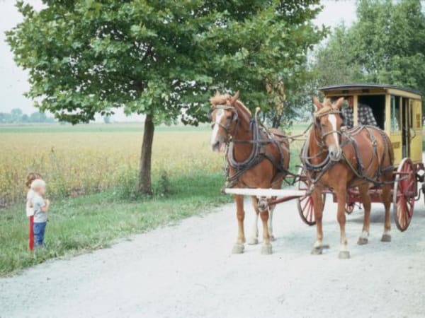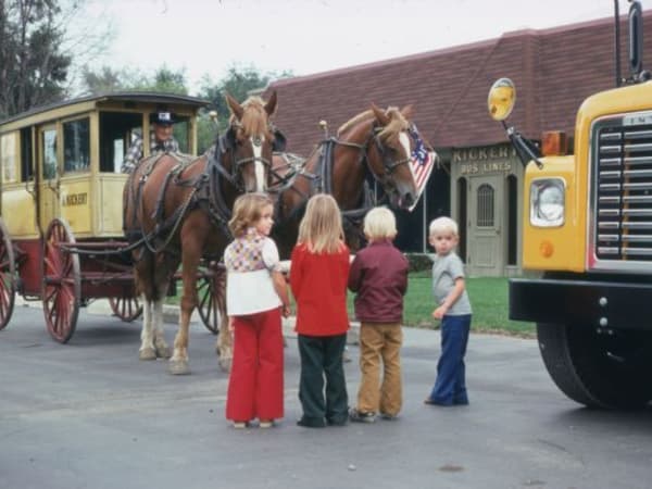 Kickert School Bus Line’s first “school bus” was a horse-drawn wagon fitted with board seats. Richard and Bessie Kickert launched the business in 1915.