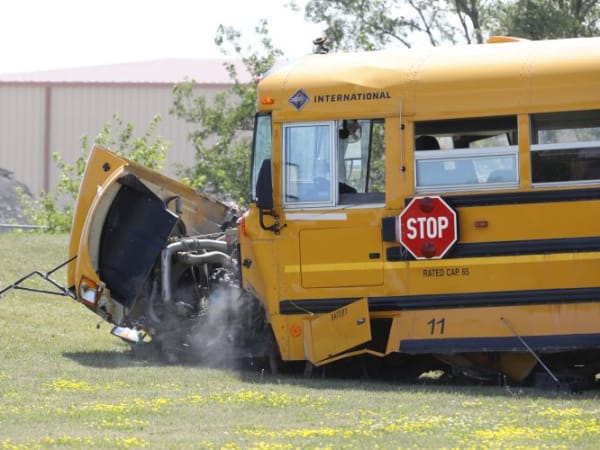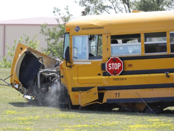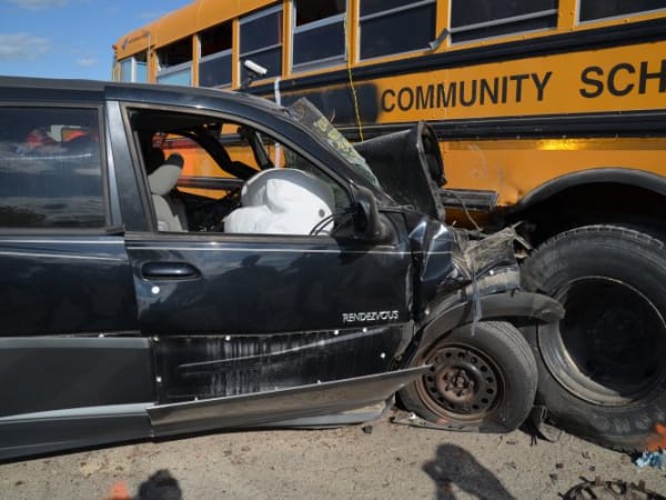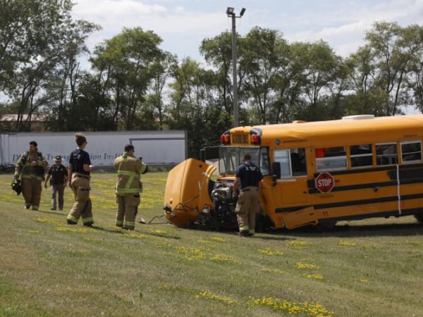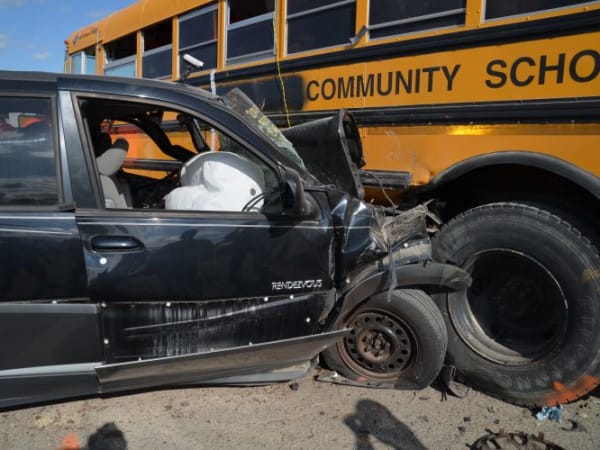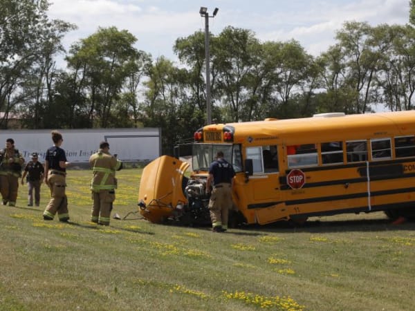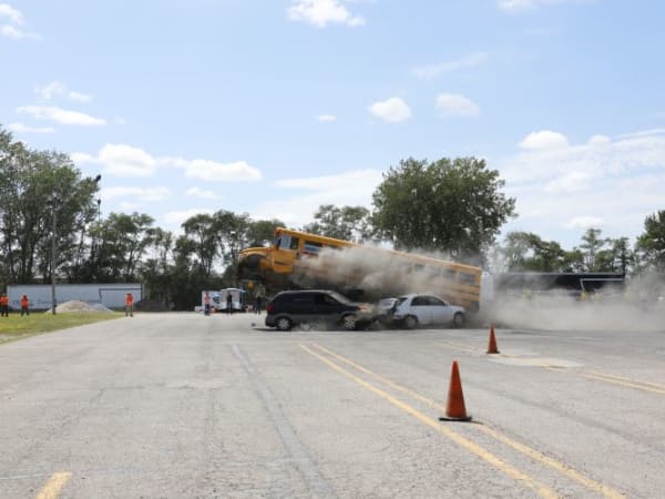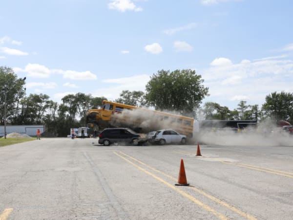 Pictured here: A school bus involved in a crash demonstration. Photo courtesy Iowa Department of Education