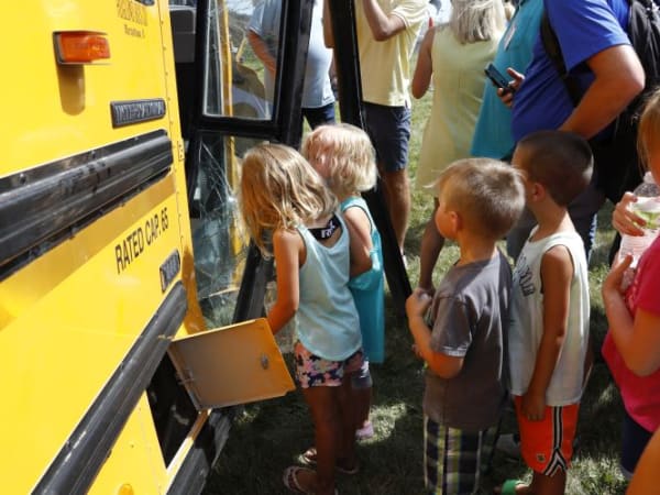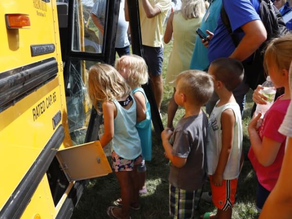 Students from Mitchellville Elementary in the Southeast Polk Community School District, who had participated in a school bus evacuation drill demonstration, investigate some of the damage that occurred during the bus crash demonstration. Photo courtesy Iowa Department of Education