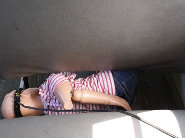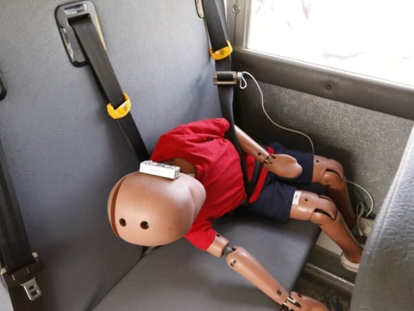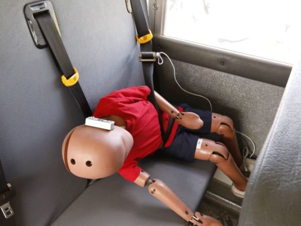 A child-size crash test dummy that was not wearing a lap-shoulder belt was thrown from the bus seat during the demonstration. Photo courtesy Iowa Department of Education