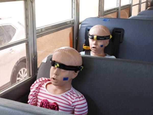 Child-size crash test dummies are placed on a bus as part of a school bus crash demonstration. The dummies are connected to electronic devices that will gather footage and data pertaining to the interior of the bus during a crash. Photo courtesy Iowa Department of Education