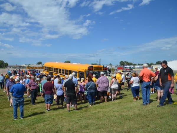 The 56th annual Iowa Pupil Transportation Association (IPTA) conference drew a total of 235 attendees. Attendees heard from a variety of experts including authors, accident investigators, and experts on federal and state laws. They also reviewed bus crash test data and video, and viewed demonstrations of disc brakes, evacuation drills, and school bus crashes. Shown here, attendees prepare to watch a school bus crash demonstration. Photo courtesy April Darling