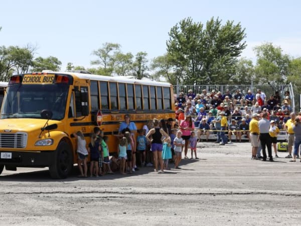 Students from Mitchellville Elementary School in the Southeast Polk Community School District demonstrate a school bus evacuation drill for attendees. Photo courtesy Iowa Department of Education