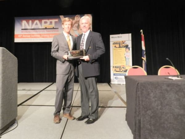 Beekman (right) became the 41st pupil transportation leader to receive the Administrator of the Year award, which SBF Executive Editor Thomas McMahon presented to him at the National Association for Pupil Transportation Summit on Nov. 10.