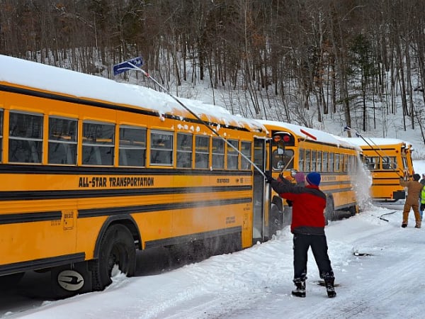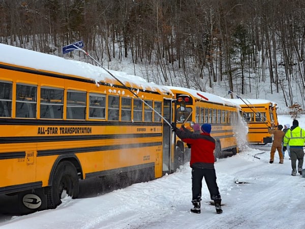 Drivers and administrative staff cleaned All-Star Transportation school buses in Connecticut, removing snow and ice. If left untouched, the snow and ice would pose a safety hazard and violate state law, according to the bus company.