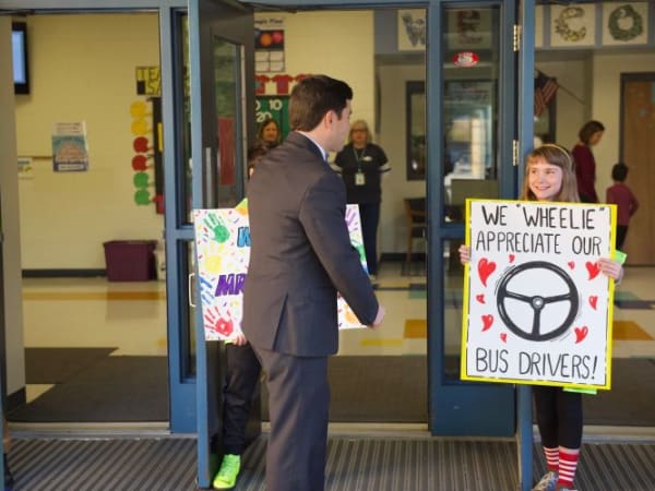 North Carolina State Superintendent Mark Johnson joined the celebration of student transporters with a visit to Salem Elementary School where he attended a breakfast held in their honor. Students gave Johnson and school bus drivers a warm wlecome.