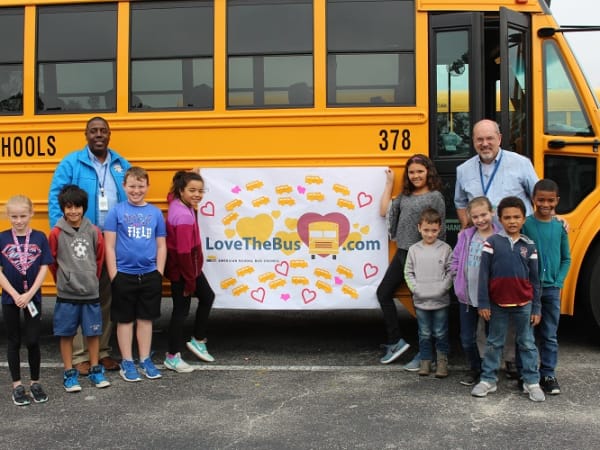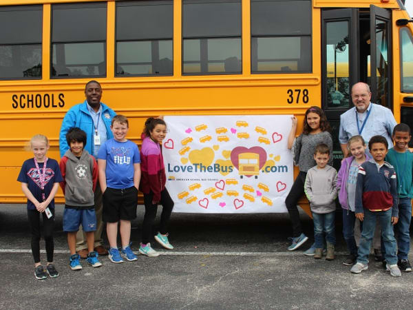 Students from Bolivia (N.C.) Elementary School posed for a photo with their bus drivers while holding up a Love the Bus poster. Photo courtesy Brunswick County Schools
