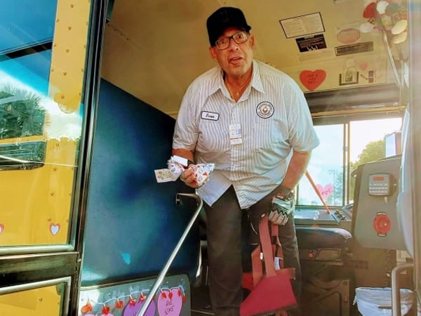 A driver for The School District of Palm Beach County (Fla.) showed his love for the bus by donning his bus with heart-shaped paper cutouts. The district says he decorates his bus for every holiday. Photo courtesy The School District of Palm Beach County