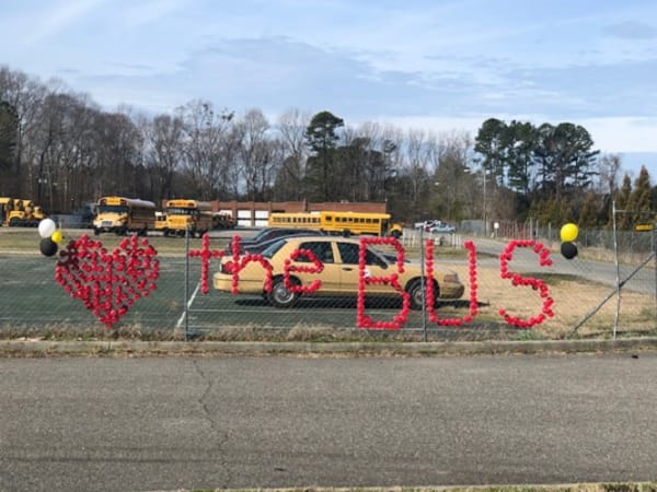 Outside the district’s school bus yard, the team created a unique Love the Bus display using plastic red cups. Photo courtesy Tanya Deckard