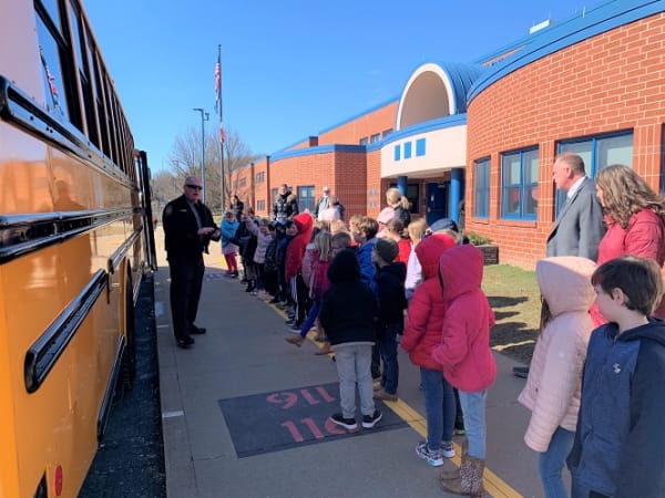 The Pennsylvania Department of Transportation and State Police celebrated Love the Bus with students at Clearfield Area Elementary School. Officers reviewed a variety of school bus safety procedures. Photo courtesy Timothy Nebgen