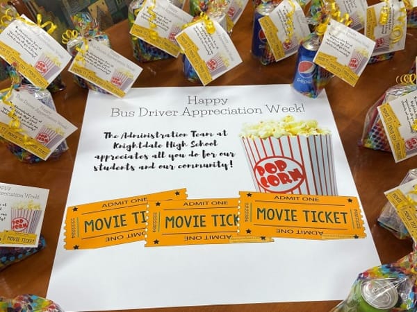 Movies anyone? Administrative staff at Knightdale High School in Wake County, N.C., handed out movie-themed treats to their bus drivers on Feb. 11. Photo courtesy Knightdale High School of Collaborative Design