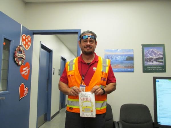 Glendale Elementary students gave hundreds of cards to all staff members in the district's transportation department. Shown here is Fred, a vehicle service worker and substitute driver for the district, with his thank you card. Photo courtesy Doris Bean