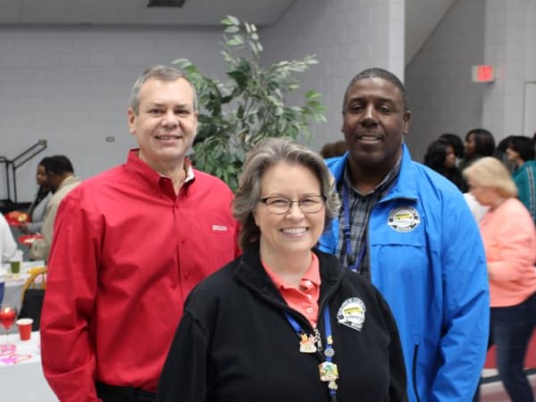 Two longtime transportation leaders who are retiring in the spring were honored at the breakfast. Shown here are Gwen Ratliff, the assistant director for Brunswick County Schools (center), Bobby Taylor, the director of transportation for the district (right), and Derek Graham, a consultant and one of the event organizers. Photo courtesy Daniel Seamans
