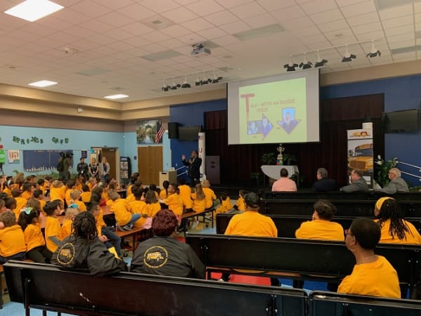 The American School Bus Council launched its annual “Love the Bus” campaign at Orange County (Fla.) Public Schools on Feb. 4. Shown here speaking to students is A.L. Reeves, director of mentoring at Harford County (Md.) Public Schools. Photo courtesy National School Transportation Association