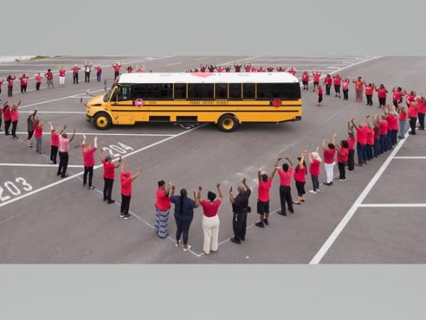 The district's transportation team showcased their creativity by forming a heart around the vehicle they love most: a school bus. Photo courtesy Orange County Public Schools