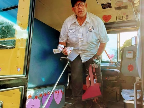 A driver for The School District of Palm Beach County (Fla.) showed his love for the bus by donning his bus with heart-shaped paper cutouts. The district says he decorates his bus for every holiday. Photo courtesy The School District of Palm Beach County