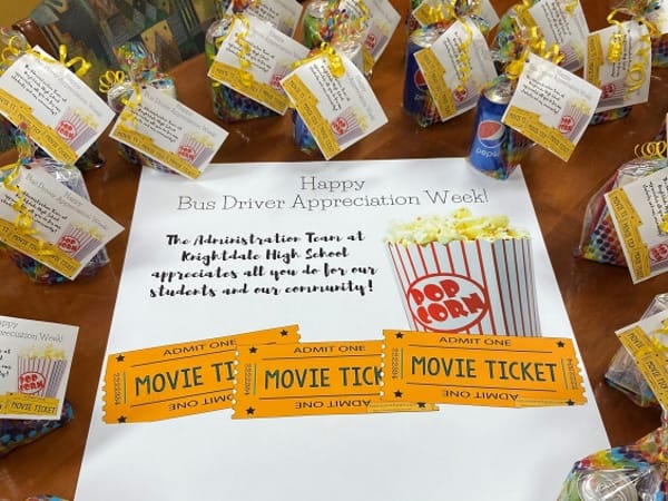 Movies anyone? Administrative staff at Knightdale High School in Wake County, N.C., handed out movie-themed treats to their bus drivers on Feb. 11. Photo courtesy Knightdale High School of Collaborative Design