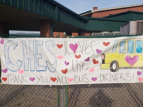 Students and staff at Corinth-Holders Elementary School in Zebulon, N.C., worked together to create a colorful banner thanking their school bus drivers. Photo courtesy Chris Kennedy