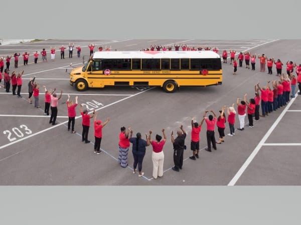 The district's transportation team showcased their creativity by forming a heart around the vehicle they love most: a school bus. Photo courtesy Orange County Public Schools