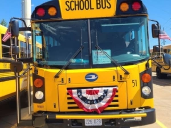 Markie Bibb's Bus No. 51 bears red, white, and blue bunting in honor of Lance Cpl. Jared Schmitz.