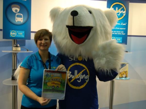 Seon’s Lori Jetha and mascot display one of the winners of the company’s anti-bullying coloring contest.