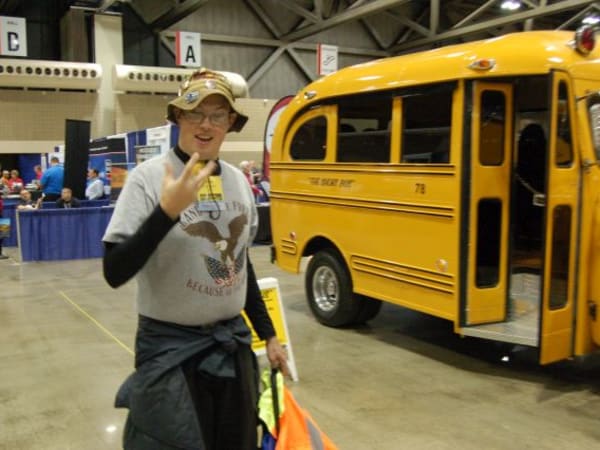 Michael Benedict Jr. checks out a gift that he picked up at one of the trade show booths. Earlier in the conference, Benedict presented a school bus safety training video that he created.
