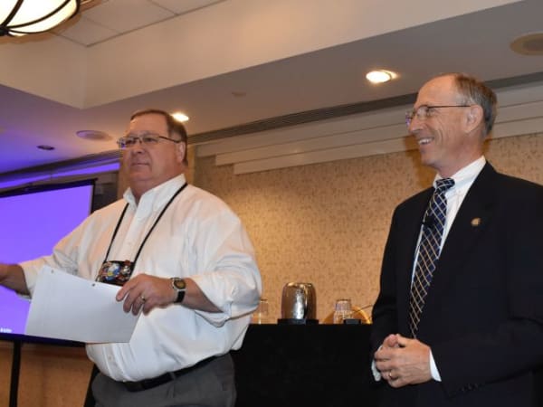 Mike LaRocco, the president of NASDPTS and Indiana state director (shown left), introduced Bruce Landsberg, the vice chairman for the National Transportation Safety Board (NTSB), who discussed safety recommendations from the agency. Those included physical performance testing, evacuation training, and lap-shoulder belts.