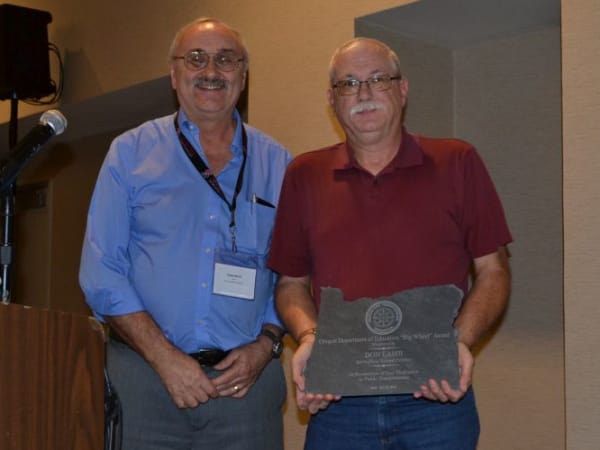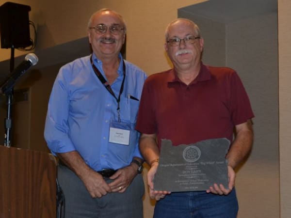 Don Lamb (right) of Springfield School District won the Oregon DOE’s Big Wheel Award for dedication to transportation. He is seen here with Craig Pruitt of the Oregon DOE.
