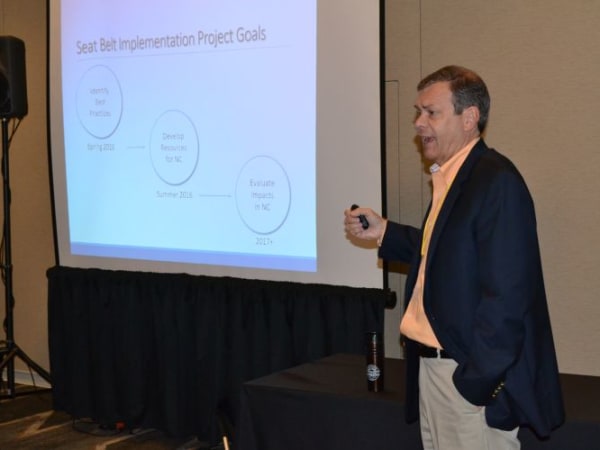 Derek Graham, a consultant and former North Carolina state director, gave presentations on several topics, including lap-shoulder belt implementation and mobile data terminals on school buses.