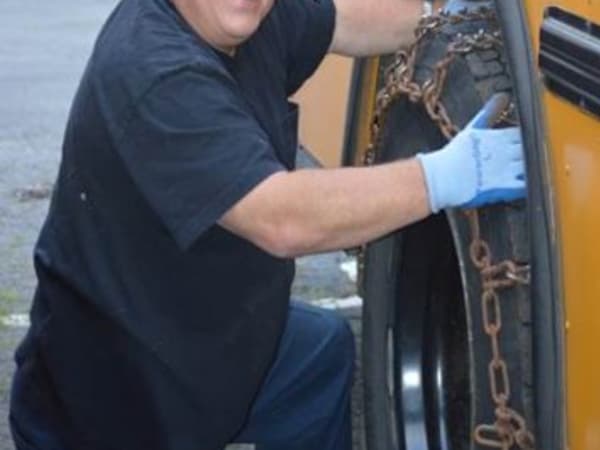 The transportation team takes steps to prepare for winter driving. Here, driver Bill Neifert installs snow chains on a bus tire.