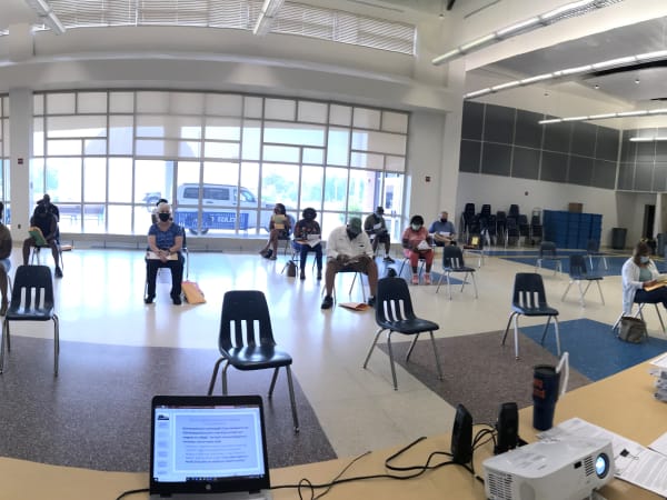 The Calvert County (Md.) Public Schools transportation department held a socially-distanced meeting on July 6 in an empty school cafeteria with bus drivers, assistants, and mechanics to discuss COVID-19 safety protocols for summer bus routes. Ed Cassidy, the director of transportation, who took the photo, told School Bus Fleet that the district began running routes for its extended school year and elementary summer school in mid-July.