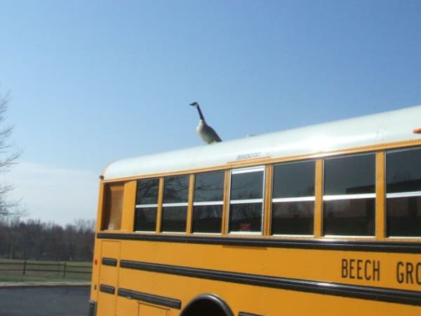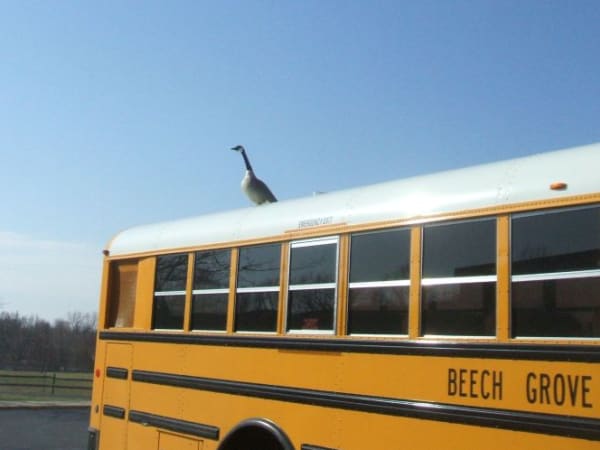 Fred Shonk, retired driver and trainer for Beech Grove (Ind.) City Schools, caught this Canada goose taking a break on the roof of his bus. Shonk joked that the bus-loving bird, which he dubbed Godfrey, could serve as an effective backup alarm.