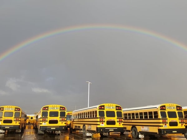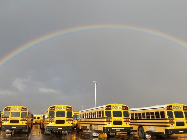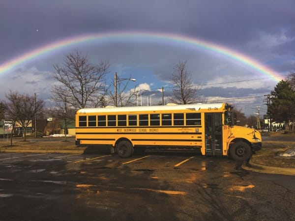 Gary Ouvry, a driver with Durham School Services in West Bloomfield, Mich., had just completed his route when he captured this shot of a rainbow perfectly placed above his school bus. Ouvry said he “couldn’t have drawn it better with a crayon.”