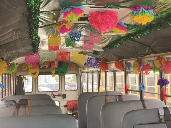 Albert Ross, a driver with San Antonio (Texas) Independent School District (ISD), spent nearly two days decorating the interior of his bus (shown here) with colorful flowers and paper cutouts for the 2019 Fiesta San Antonio. The annual event is held every April to celebrate the city’s vibrant culture.
