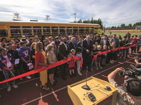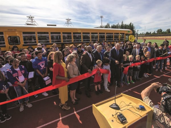Franklin Pierce Schools in Tacoma, Wash., unveiled the district’s and the state’s first electric school bus during an elaborate ribbon-cutting ceremony on June 17. Photo courtesy Office of Gov. Jay Inslee