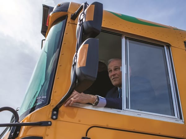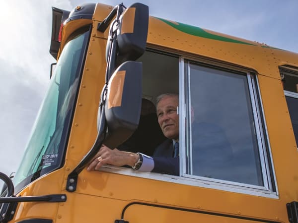 School district officials, students, parents, and several state and local officials attended the ceremony, including Gov. Jay Inslee, who hopped aboard the new bus as it took a lap around Franklin Pierce High School’s stadium track. Photo courtesy Office of Gov. Inslee