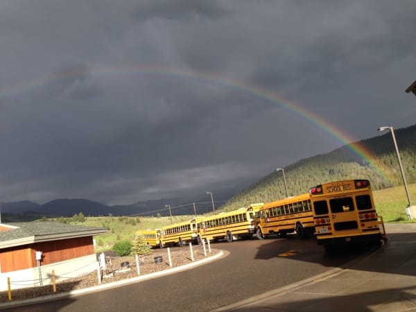 The “big sky” in Big Sky, Montana, on this June afternoon included a spectacular rainbow, as seen above the bus loop at Big Sky School District #72. Ron Downer, the district’s facilities director and transportation supervisor, took the shot right outside his office door.