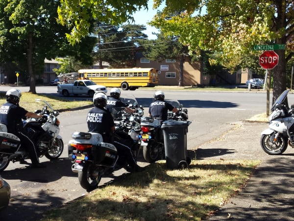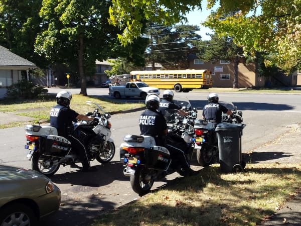 Police officers in Salem, Oregon, stake out a school bus stop for illegal passers. Michael Shields, director of transportation and auxiliary services for Salem-Keizer Public Schools, says that the police have done a great job of identifying local spots that have high numbers of violators.