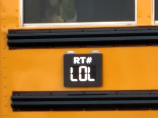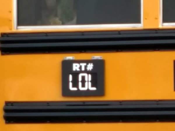 Is laughing out loud (LOL) allowed on this bus? The route ID seems to suggest that it is. Louk Markham, a former school transportation director in California, submitted the pic of this chuckle-worthy “sign of the times,” as he put it.