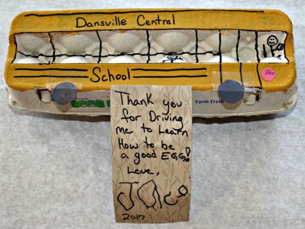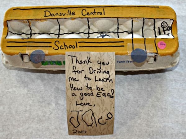 School bus seating compartmentalization is often likened to an egg carton. This thank-you note, from a 4-year-old student to a driver at Dansville (N.Y.) Central School District, puts a new spin on the egg carton analogy.
