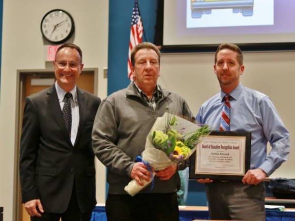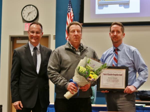 DATTCO school bus driver Randy Kronick (center) was honored in February for keeping a 9-year-old girl from crossing the street when he saw a speeding SUV that failed to stop for the bus. Kronick credited his actions to DATTCO safety procedures that include maintaining eye contact and giving students a cue when it is safe to cross.