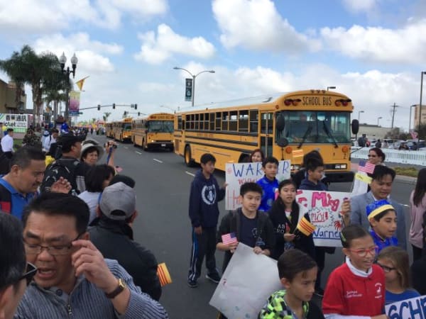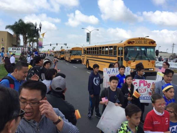 School buses from Westminster (Calif.) School District took part in the local Little Saigon Tet Parade. The Feb. 4 festivity marked the Lunar New Year, which is considered the most important celebration in Vietnamese culture. Photo by Kim Pham