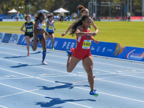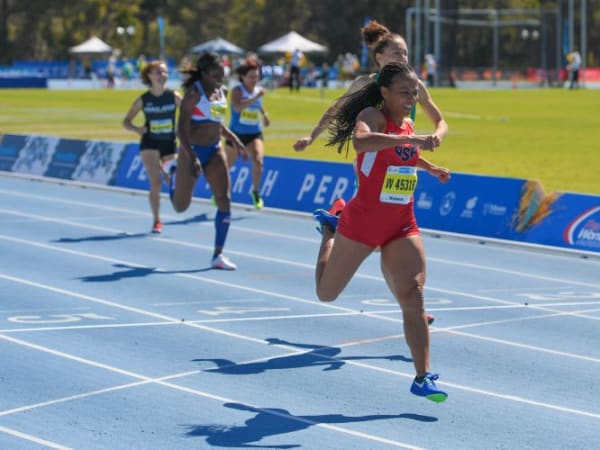 That’s one fast bus driver! Emma McGowan (in red), who drives a special-needs bus for Gwinnett County (Ga.) Public Schools, won gold medals in the 100-meter and 200-meter competitions at the 2016 World Masters Track and Field Championships in Australia. Photo by Rob Jerome