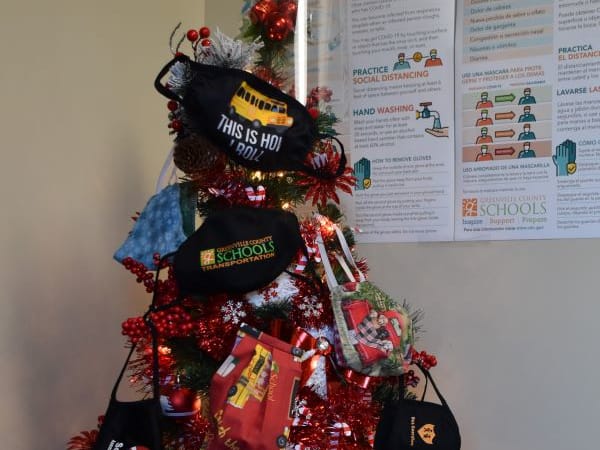 The Christmas tree in the transportation department of Greenville (S.C.) Public Schools is festive, and sports a timely theme. “We are extremely proud that our Christmas tree is following safety procedures. As you see, it is using PPE and wearing mask and a shield,” Teena Mitchell, special-needs transportation coordinator for the district, joked to School Bus Fleet.