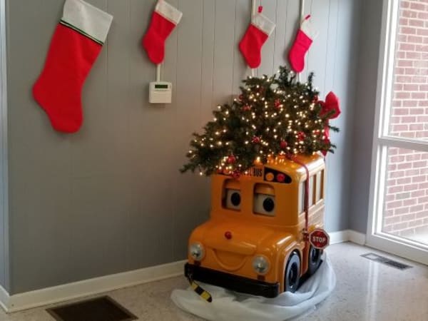 Buster the Bus provides a festive holiday greeting to those visiting the transportation office of Lincoln County (N.C.) Schools.