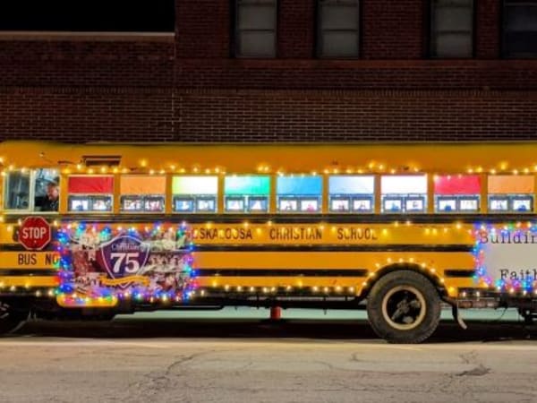 Oskaloosa (Iowa) Christian School bus entry in the Oskaloosa Parade of Lights event won first place in the People's Choice category for its unique use of iPads. “We recorded our students waving to the parade crowd [to create a] ‘reverse parade' format, and it struck a chord,” Don Mitchell, the district’s principal, told SBF.