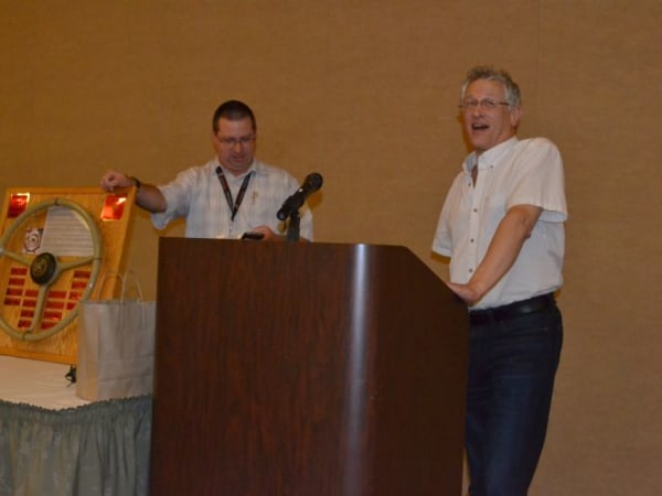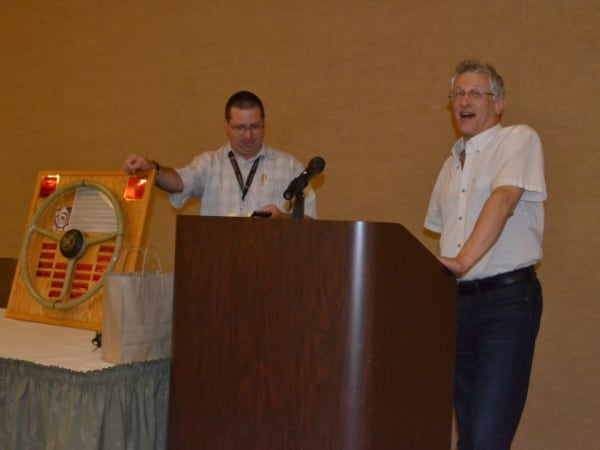 Bill Cohen (right), who recently retired from the Oregon Driver and Motor Vehicles department, receives the Big Wheel Award from T.J. Crockett of the Oregon Department of Education.