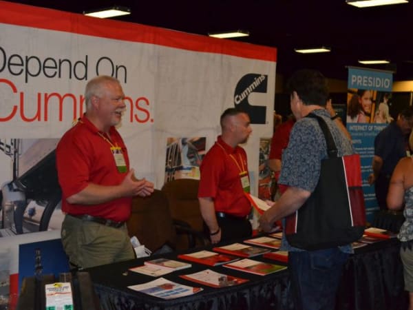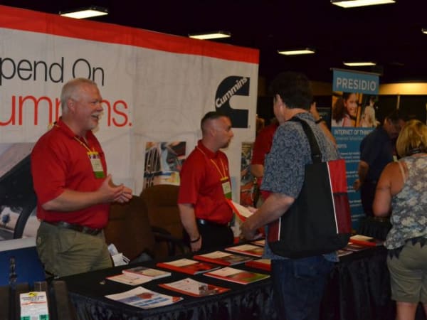 Cummins representatives talk with attendees during the trade show. Engine, transmission, and bus manufacturers also held maintenance workshops for technicians.