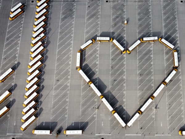 HONORABLE MENTION: Steve Valtinson, manager, fleet services, Orange County Public Schools in Orlando, Fla., captured this image of the district's fleet from high overhead for Love the Bus Month using a drone.